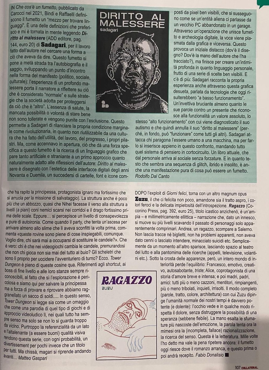 In questo graphic novel, che parte dal dato autobiografico per espandersi a un’invettiva che si fa manifesto, sadagari si e ci interroga su questi nodi centrali della contemporaneità: la neurodivergenza e la disabilità, l’accettazione di sé e dell’altro, il malessere psicologico come condizione socialmente diffusa, spesso ignorata o relegata a una sfera personale da tenere nascosta. Affermare il proprio diritto al malessere diventa un atto rivoluzionario.